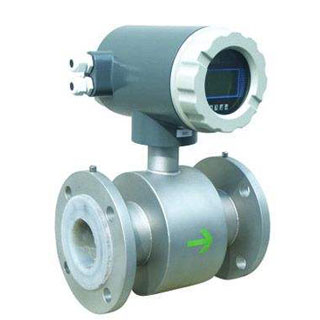 管道电磁流量计测量原理是基于法拉第电磁感应定律。流量计的测量管是一内衬绝缘材料的非导磁合金短管。两只电极沿管径方向穿通管壁固定在测量管上。其电极头与衬里内表面基本齐平。励磁线圈由双方波脉冲励磁时,将在与测量管轴线垂直的方向上产生一磁通量密度为B的工作磁场。此时,如果具有一定电导率的流体流经测量管。将切割磁力线感应出电动势E。电动势E正比于磁通量密度B,测量管内径d与平均流速v的乘积。电动势E(流量信号)由电极检出并通过电缆送至转换器。转化器将流量信号放大处理后,可显示流体流量,并能输出脉冲,模拟电流等信号,用于流量的控制和调节。